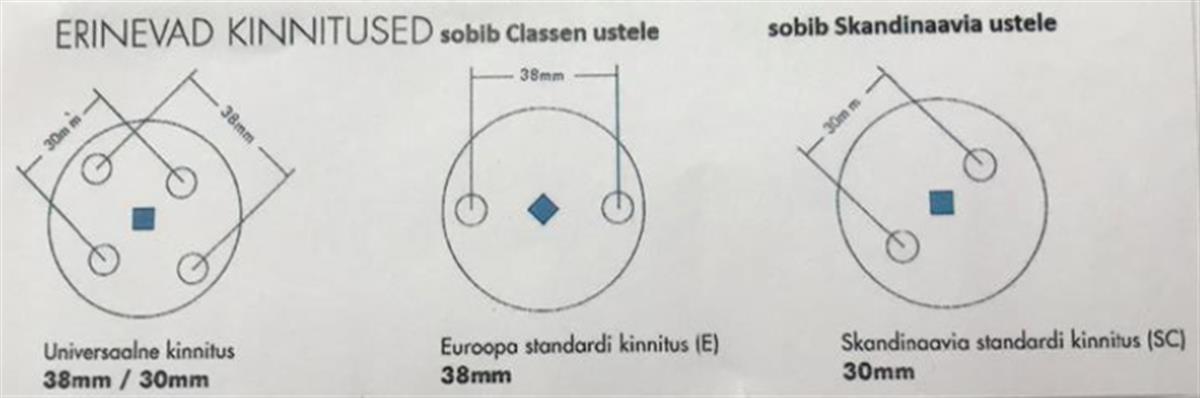 Erinevate kinnitustega, sobib nii skandinaavia kui ka Euro standard ustele.