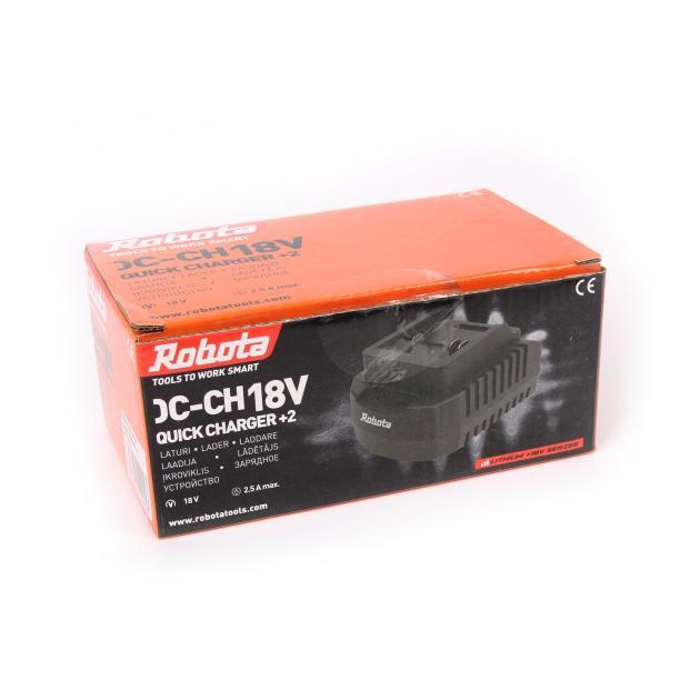 Võrgutoitel laadija Robota DC 18V akudele. Laadimisvõimsus on 1,5 A. Laadimisajad: 2,0 Ah aku – 90 minutit, 4,0 Ah aku – 160 minutit.