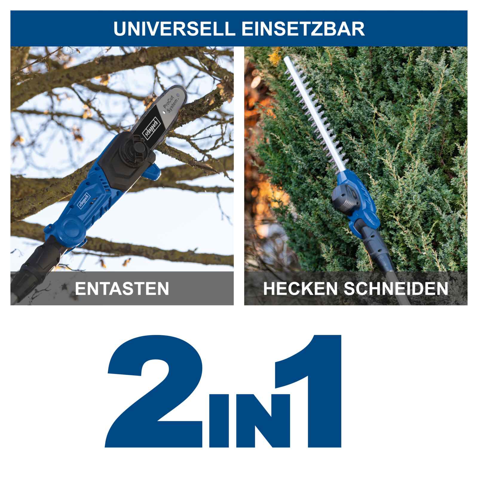 Scheppach 2in1 juhtmeta multifunktsionaalse seadmega C-PHTS410-X saab kõrgemaid oksi või kõrgeid hekke lihtsalt maast pügada. Hekilõikuri kinnitust saab lukustada 11 erineva nurga all, varraslõikuril on 4 erinevat asendit. See võimaldab optimaalselt kohaneda vastava rakendusega. Õlarihm pakub täiendavat tuge ja võimaldab töötada pikemat aega. Scheppach IXES 20-voldise seeria osana saab kõiki süsteemiseeria akusid ja laadijaid kombineerida multifunktsionaalse seadmega. Aku ja laadija on saadaval eraldi.