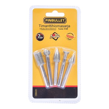 Komplektis 5 freesi: 1x silinder, 1x kuul, 1x terava otsaga sirge koonus, 1x ümara otsaga sirge koonus, 1x tagurpidi koonus.