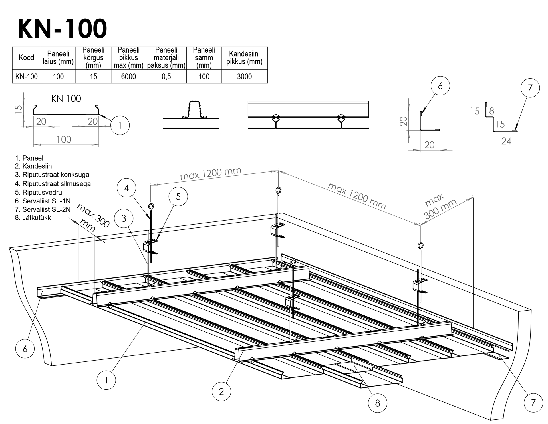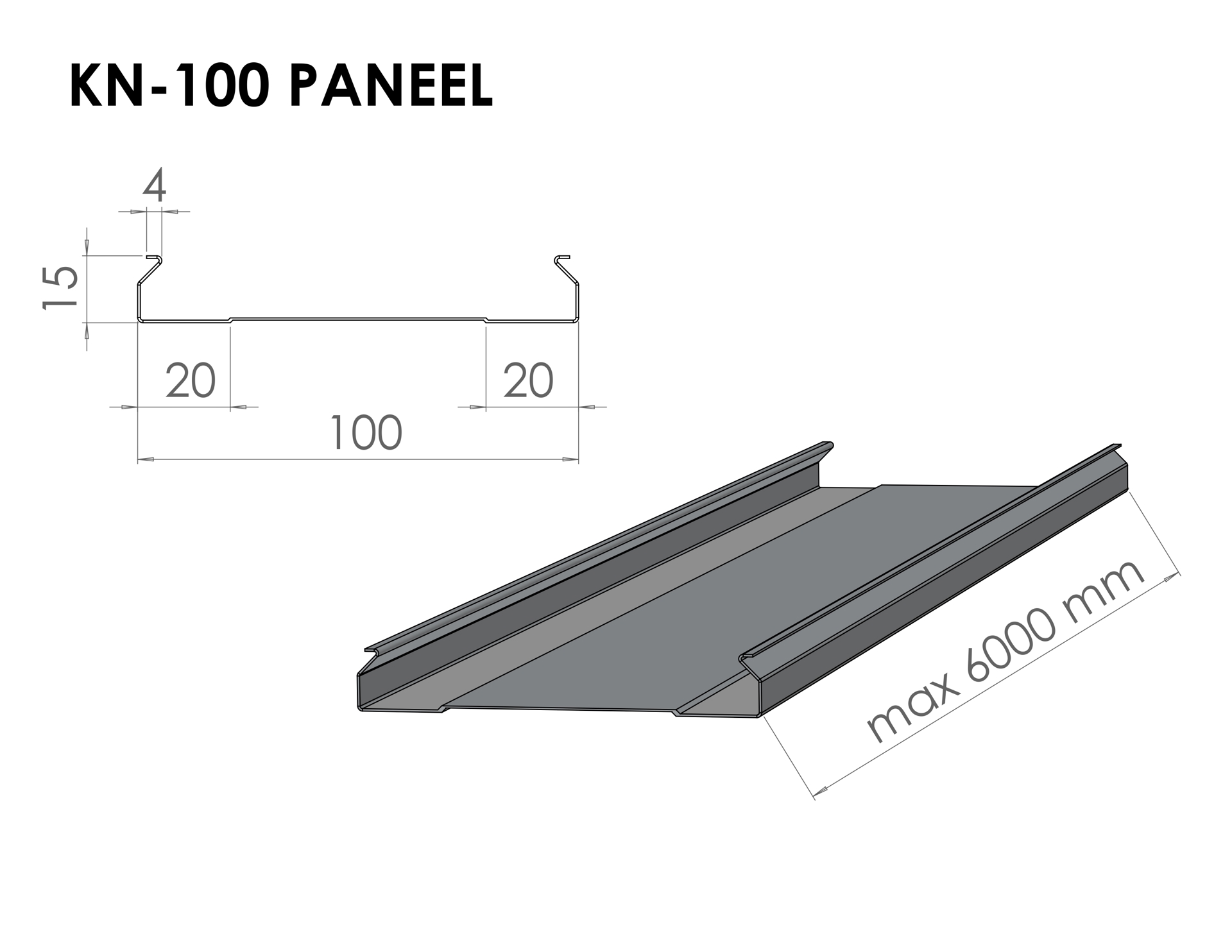- Paneelripplagi KN-profiil on ilma vuukideta ripplae tüüp, valmistatakse alumiiniumplekist paksusega 0,5 mm, paneelide samm 100mm