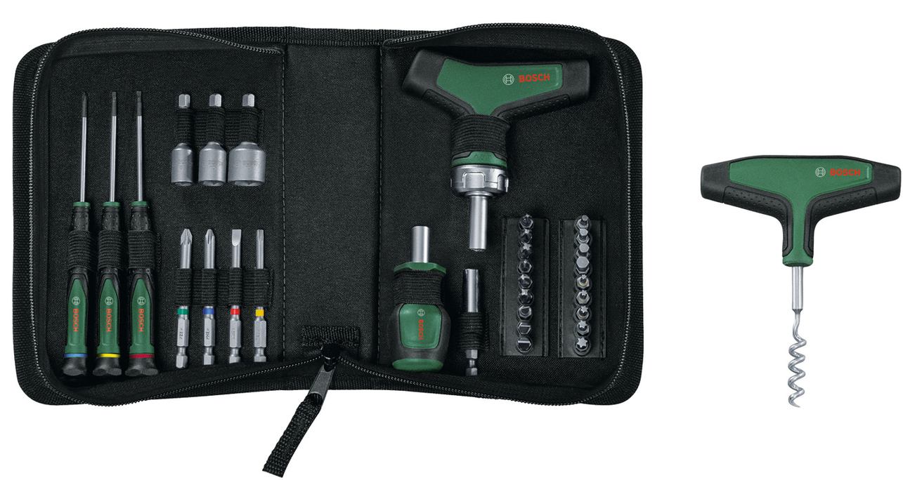 33-osaline tööriistakomplekt. Komplektis 3 täppiskruvikeerajat; väike vahetatavate otsakutega kruvikeeraja ja T-kujuline, vahetatavate