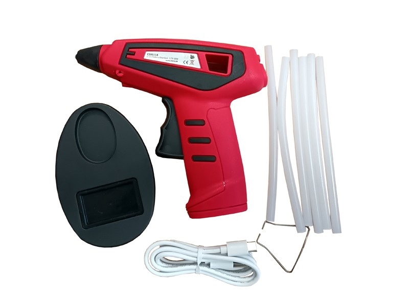 Li-ion akuga liimipüstol. Komplekt sisaldab: liimipulgad (6tk), püstoli alus/hoidik, USB-C kaabel.