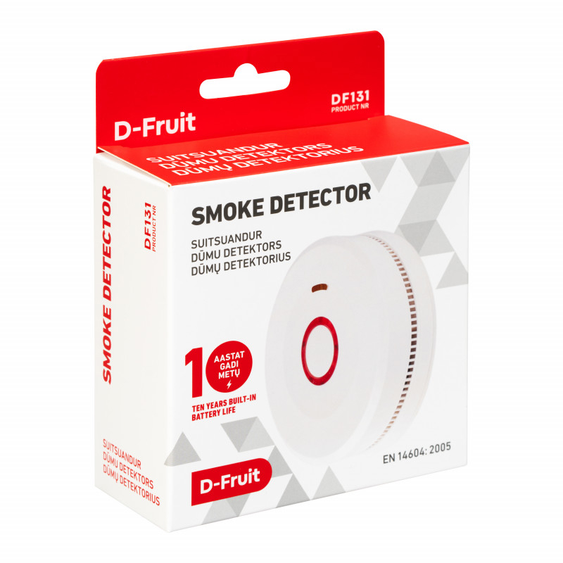 D-Fruit DF131 on usaldusväärne optiline suitsuandur, mis tuvastab nähtava suitsu ja annab ohust koheselt märku tugeva helisignaaliga. Seade on varustatud testnupu ja märgutulega ning selle sisseehitatud aku kestab kuni 10 aastat, võimaldades pikaajalist ja muretut kasutamist.