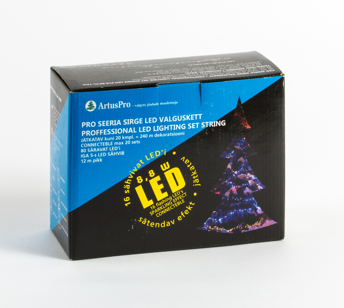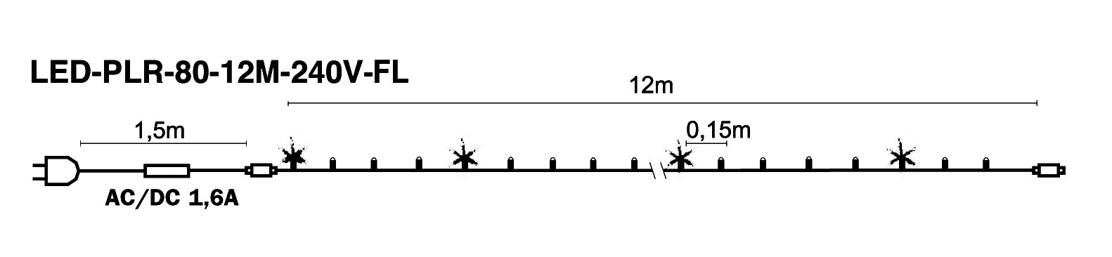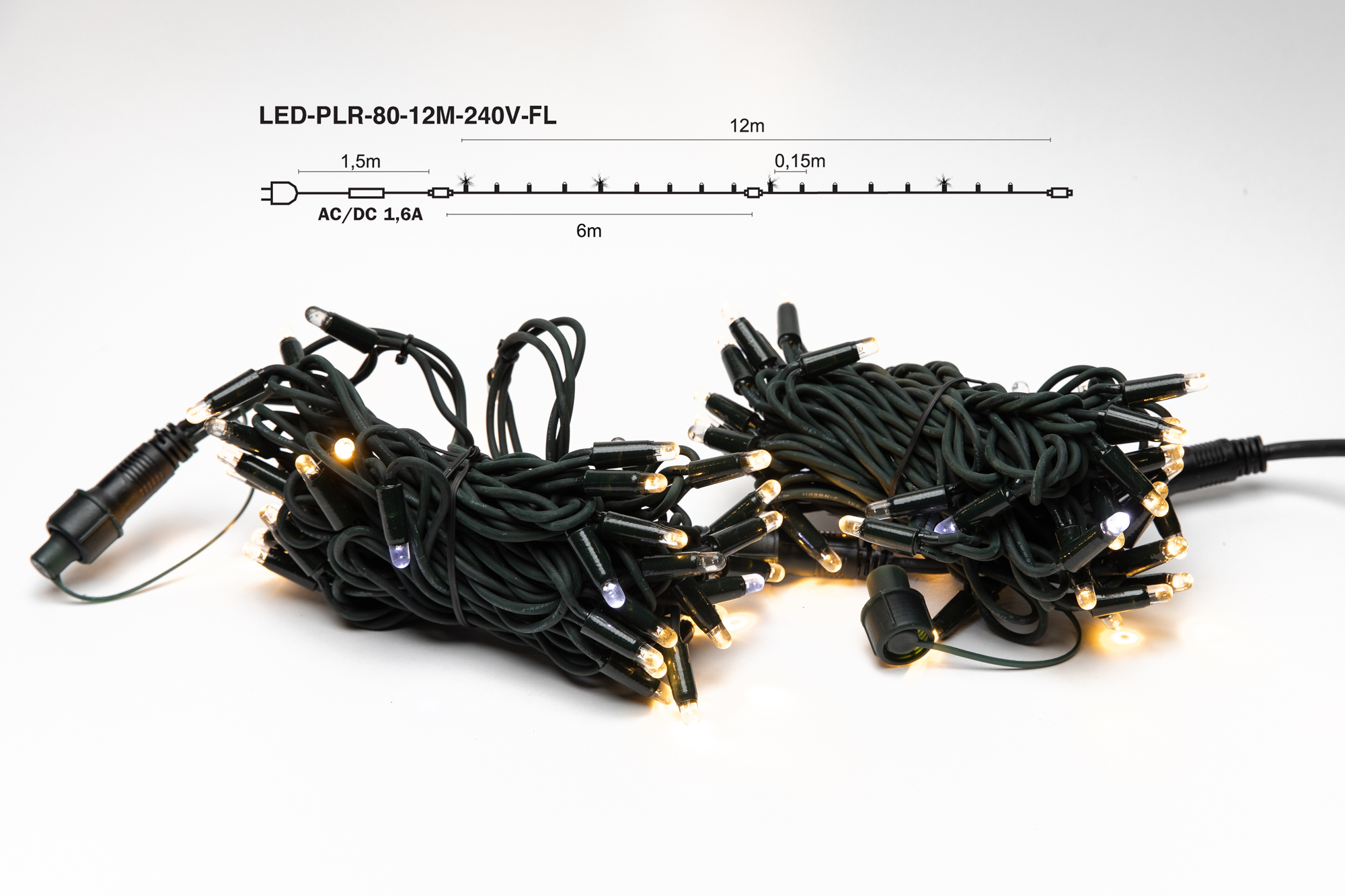 Pikk, sirge, 80 LED-ga jätkatav valguskett tumerohelisel kaablil. Iga viies LED vilgub, moodustades dekoratsioonis sädeleva efekti.Valgusketi pikkus 12m., mis koosneb kahest 6m. lülist. Toitejuhe on komplektis kaasas. Valgusketti saab jätkata kuni 25 komplekti. Sobib kasutamiseks välitingimustes. Soovituslikud kasutuskohad: Puud, põõsad, hoonete piirjooned.