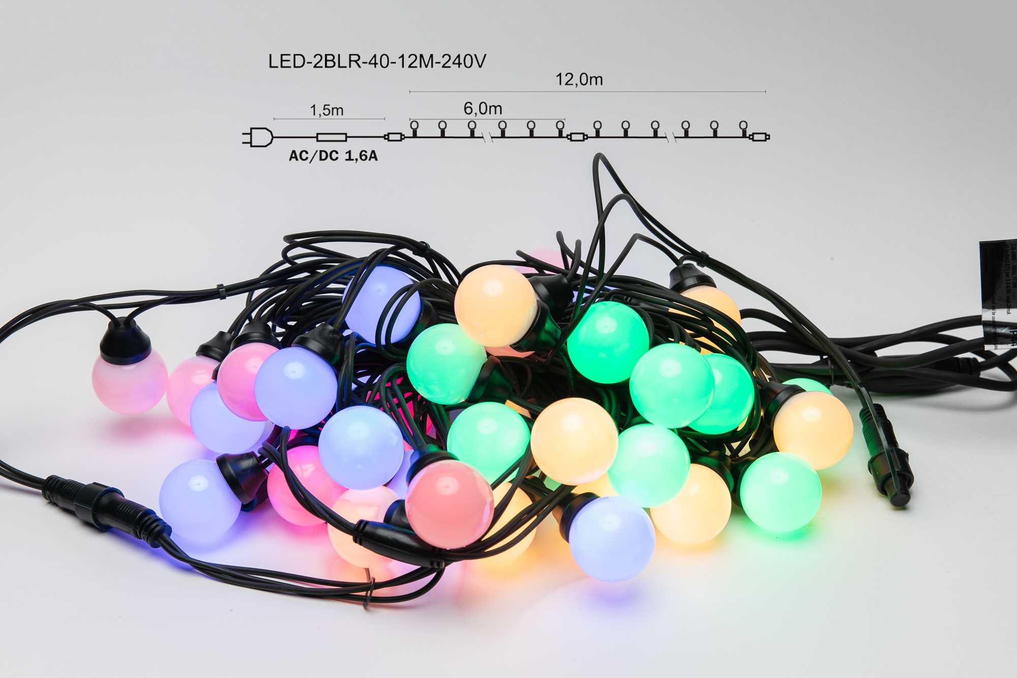 Pikk, sirge, 40 LED-ga profiseeria jätkatav valguskett tumerohelisel kaablil. Valgusketi pikkus 12m., mis koosneb kahest 6m. lülist. Valguskuuli läbimõõt 4cm. Toitejuhe on komplektis kaasas. Valgusketti saab jätkata kuni 25 komplekti. Sobib kasutamiseks välitingimustes. Soovituslikud kasutuskohad: Puud, põõsad, hoonete piirjooned.