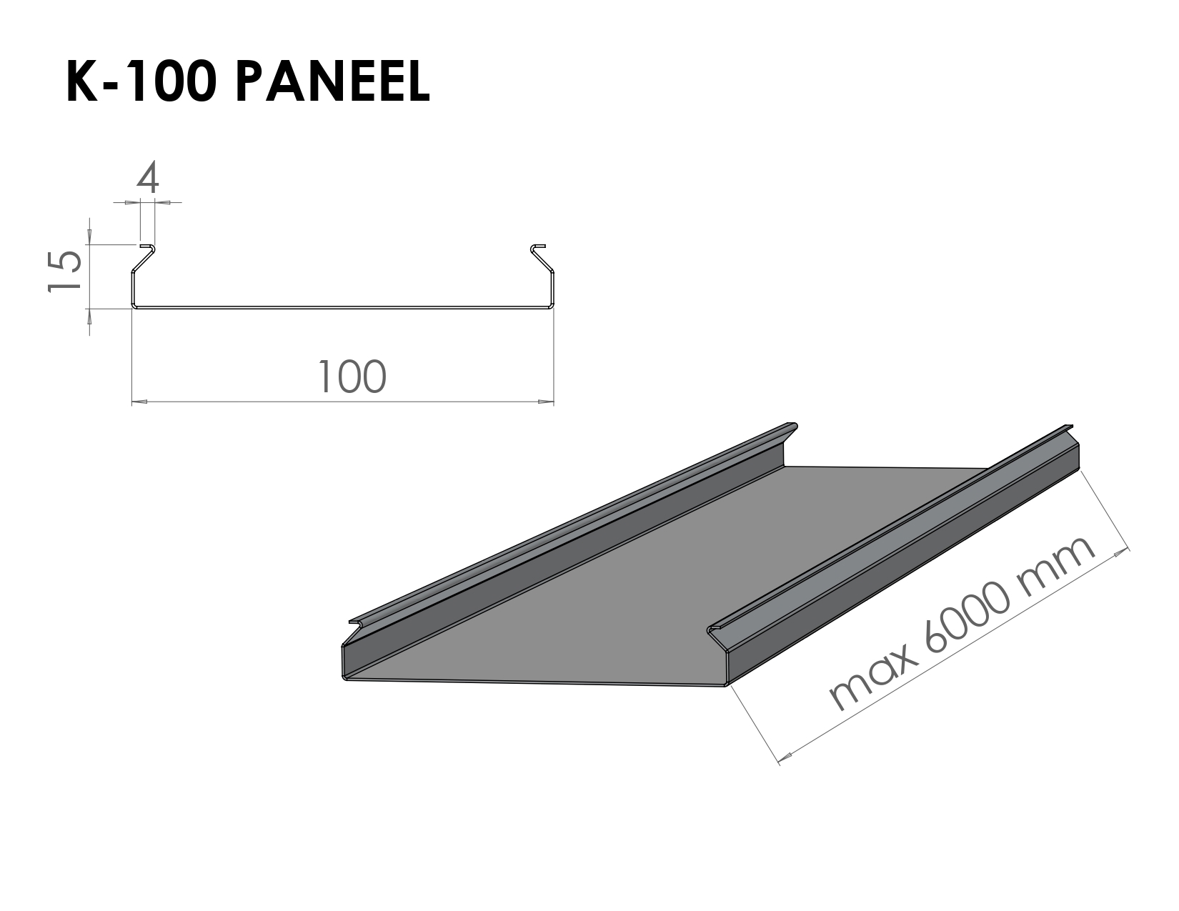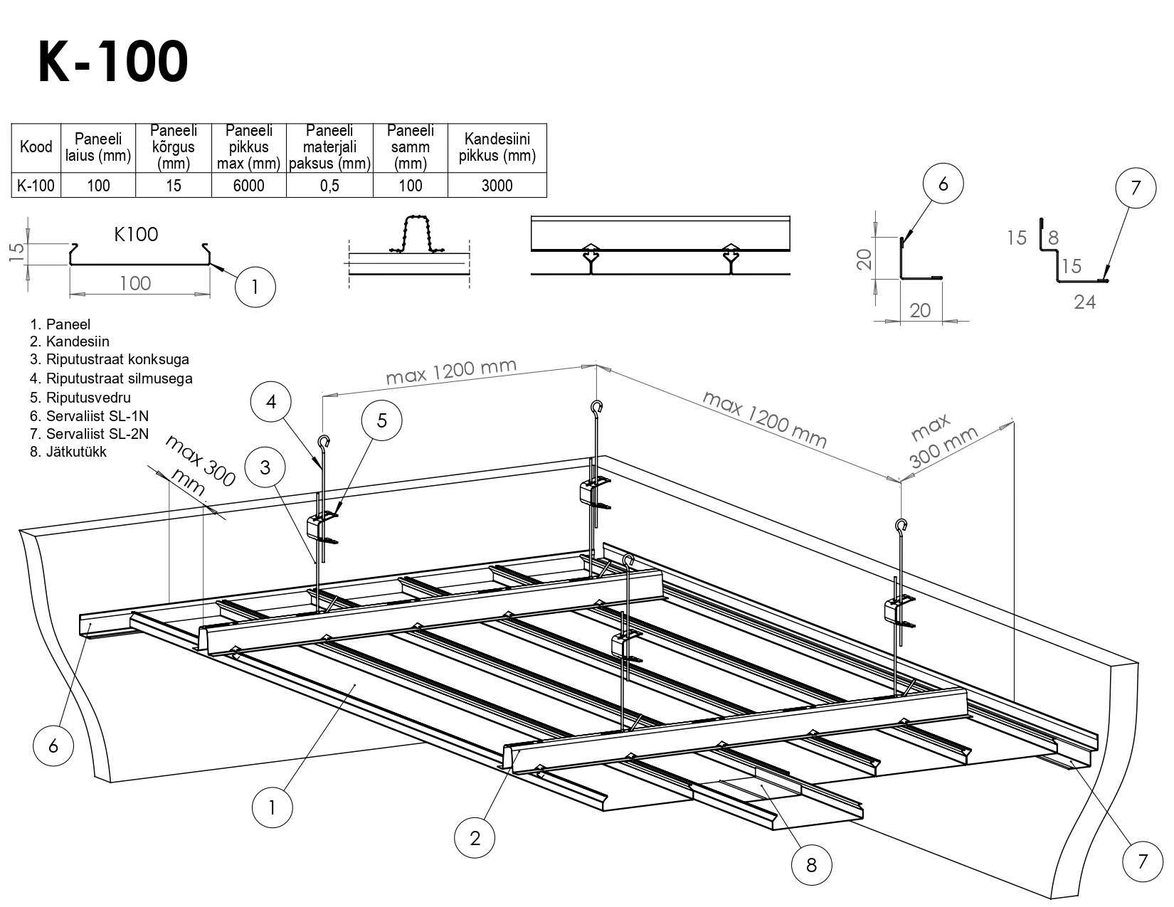 - Paneelripplagi K-profiil on ilma vuukideta ripplae tüüp, valmistatakse alumiiniumplekist paksusega 0,5 mm, paneelide samm 100mm