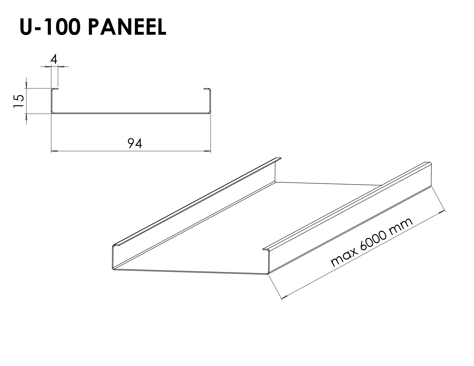 - Paneelripplagi U-profiil on 3 mm vuugiga ripplae tüüp, valmistatakse alumiiniumplekist paksusega 0,5 mm, paneelide samm 100mm